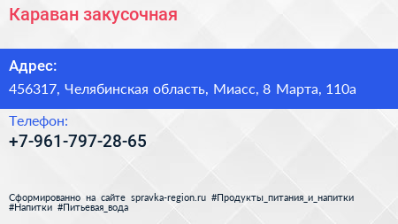 Караван, закусочная по адресу 456317, Челябинская область, Миасс, 8 Марта, 110а в дальнейшем Организация, размещена в следующих категориях: