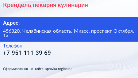 Крендель, пекарня-кулинария по адресу 456320, Челябинская область, Миасс, проспект Октября, 1а в дальнейшем Организация, размещена в следующих категориях: