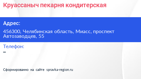 Круассаныч, пекарня-кондитерская по адресу 456300, Челябинская область, Миасс, проспект Автозаводцев, 55 в дальнейшем Организация, размещена в следующих категориях: