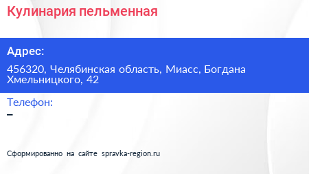 Кулинария-пельменная по адресу 456320, Челябинская область, Миасс, Богдана Хмельницкого, 42 в дальнейшем Организация, размещена в следующих категориях: