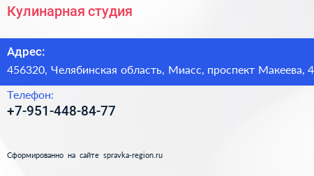 Кулинарная студия по адресу 456320, Челябинская область, Миасс, проспект Макеева, 4 в дальнейшем Организация, размещена в следующих категориях: