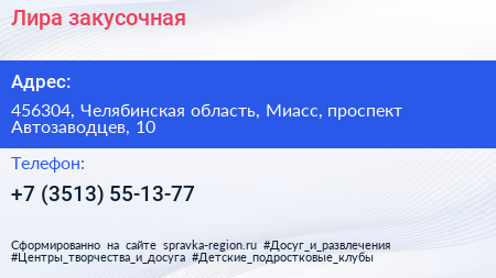 Лира, закусочная по адресу 456304, Челябинская область, Миасс, проспект Автозаводцев, 10 в дальнейшем Организация, размещена в следующих категориях: