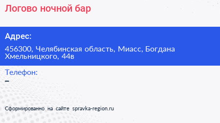 Логово, ночной бар по адресу 456300, Челябинская область, Миасс, Богдана Хмельницкого, 44в в дальнейшем Организация, размещена в следующих категориях: