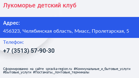 Лукоморье, детский клуб по адресу 456323, Челябинская область, Миасс, Пролетарская, 5 в дальнейшем Организация, размещена в следующих категориях: