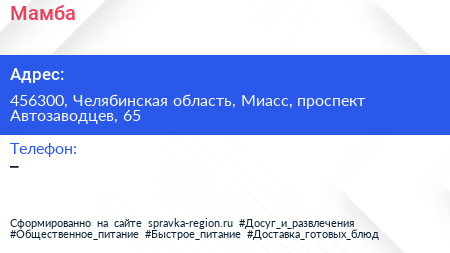 Мамба по адресу 456300, Челябинская область, Миасс, проспект Автозаводцев, 65 в дальнейшем Организация, размещена в следующих категориях: