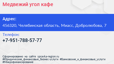 Медвежий угол, кафе по адресу 456320, Челябинская область, Миасс, Добролюбова, 7 в дальнейшем Организация, размещена в следующих категориях: