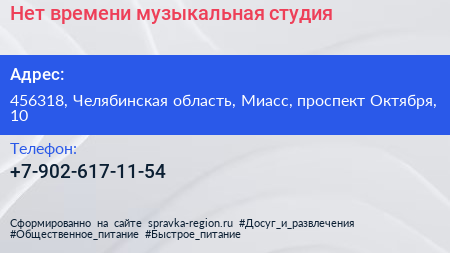 Нет времени, музыкальная студия по адресу 456318, Челябинская область, Миасс, проспект Октября, 10 в дальнейшем Организация, размещена в следующих категориях: