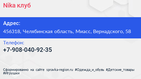 Nika, клуб по адресу 456318, Челябинская область, Миасс, Вернадского, 58 в дальнейшем Организация, размещена в следующих категориях: