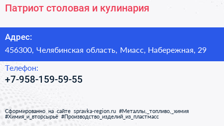 Патриот, столовая и кулинария по адресу 456300, Челябинская область, Миасс, Набережная, 29 в дальнейшем Организация, размещена в следующих категориях: