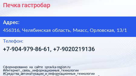 Печка, гастробар по адресу 456316, Челябинская область, Миасс, Орловская, 13/1 в дальнейшем Организация, размещена в следующих категориях: