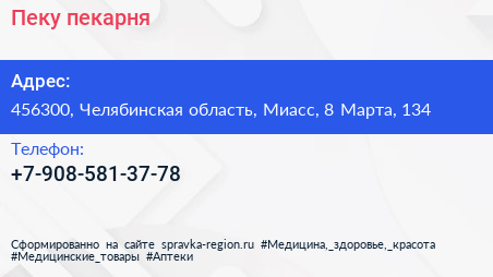Пеку, пекарня по адресу 456300, Челябинская область, Миасс, 8 Марта, 134 в дальнейшем Организация, размещена в следующих категориях: