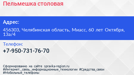 Пельмешка, столовая по адресу 456303, Челябинская область, Миасс, 60 лет Октября, 13а/4 в дальнейшем Организация, размещена в следующих категориях: