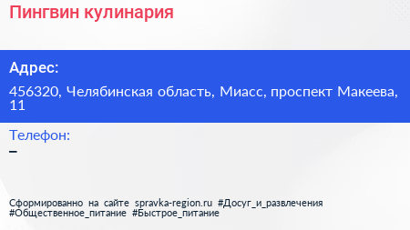 Пингвин, кулинария по адресу 456320, Челябинская область, Миасс, проспект Макеева, 11 в дальнейшем Организация, размещена в следующих категориях: