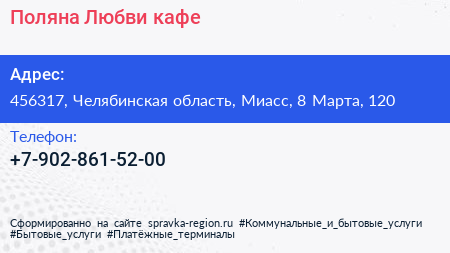 Поляна Любви, кафе по адресу 456317, Челябинская область, Миасс, 8 Марта, 120 в дальнейшем Организация, размещена в следующих категориях:
