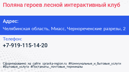 Поляна героев, лесной интерактивный клуб по адресу Челябинская область, Миасс, Чернореченские разрезы, 2 в дальнейшем Организация, размещена в следующих категориях: