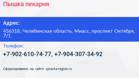 Пышка, пекарня по адресу 456318, Челябинская область, Миасс, проспект Октября, 7/1 в дальнейшем Организация, размещена в следующих категориях: