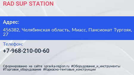 RAD SUP STATION по адресу 456382, Челябинская область, Миасс, Пансионат Тургояк, 27 в дальнейшем Организация, размещена в следующих категориях: