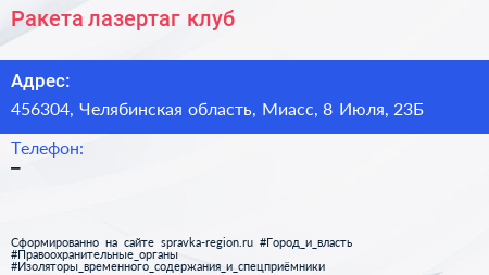 Ракета, лазертаг-клуб по адресу 456304, Челябинская область, Миасс, 8 Июля, 23Б в дальнейшем Организация, размещена в следующих категориях: