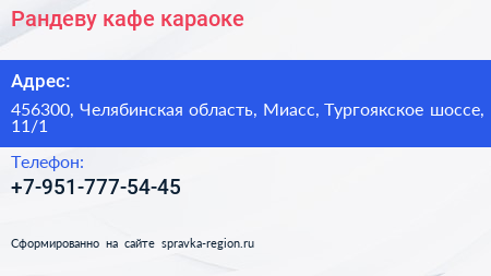 Рандеву, кафе-караоке по адресу 456300, Челябинская область, Миасс, Тургоякское шоссе, 11/1 в дальнейшем Организация, размещена в следующих категориях: