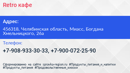 Retro, кафе по адресу 456318, Челябинская область, Миасс, Богдана Хмельницкого, 26а в дальнейшем Организация, размещена в следующих категориях: