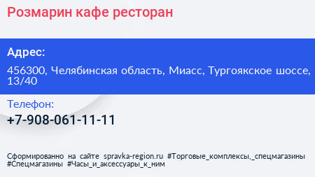 Розмарин, кафе-ресторан по адресу 456300, Челябинская область, Миасс, Тургоякское шоссе, 13/40 в дальнейшем Организация, размещена в следующих категориях: