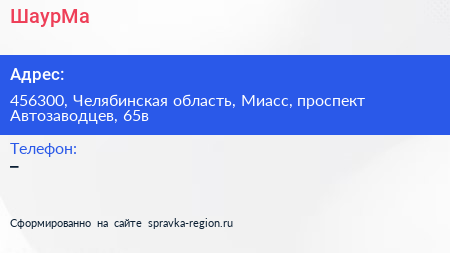 ШаурМа по адресу 456300, Челябинская область, Миасс, проспект Автозаводцев, 65в в дальнейшем Организация, размещена в следующих категориях: