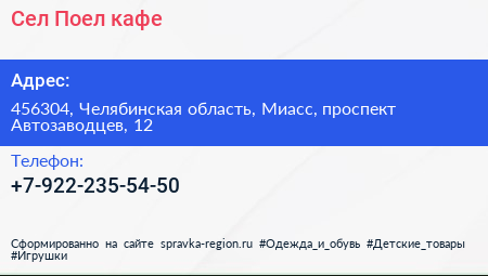 Сел-Поел, кафе по адресу 456304, Челябинская область, Миасс, проспект Автозаводцев, 12 в дальнейшем Организация, размещена в следующих категориях: