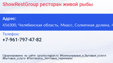 ShowRestGroup, ресторан живой рыбы по адресу 456300, Челябинская область, Миасс, Солнечная долина, 4 в дальнейшем Организация, размещена в следующих категориях:
