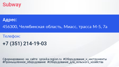 Subway по адресу 456300, Челябинская область, Миасс, трасса М-5, 7а в дальнейшем Организация, размещена в следующих категориях: