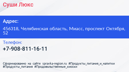 Суши Люкс по адресу 456318, Челябинская область, Миасс, проспект Октября, 52 в дальнейшем Организация, размещена в следующих категориях: