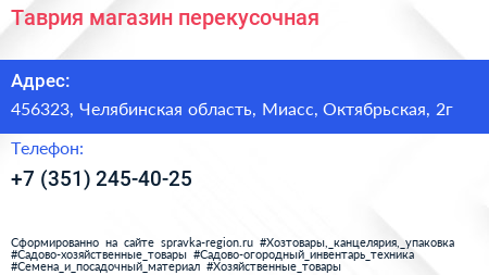 Таврия, магазин-перекусочная по адресу 456323, Челябинская область, Миасс, Октябрьская, 2г в дальнейшем Организация, размещена в следующих категориях:
