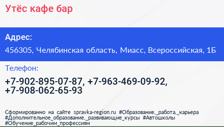 Утёс, кафе-бар по адресу 456305, Челябинская область, Миасс, Всероссийская, 1Б в дальнейшем Организация, размещена в следующих категориях: