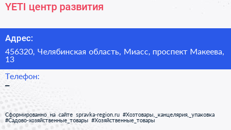 YETI, центр развития по адресу 456320, Челябинская область, Миасс, проспект Макеева, 13 в дальнейшем Организация, размещена в следующих категориях: