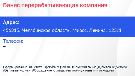 Банис, перерабатывающая компания по адресу 456315, Челябинская область, Миасс, Ленина, 123/1 в дальнейшем Организация, размещена в следующих категориях:
