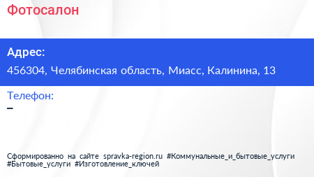 Фотосалон по адресу 456304, Челябинская область, Миасс, Калинина, 13 в дальнейшем Организация, размещена в следующих категориях: