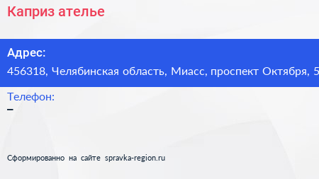 Каприз, ателье по адресу 456318, Челябинская область, Миасс, проспект Октября, 5 в дальнейшем Организация, размещена в следующих категориях:
