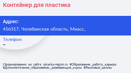 Контейнер для пластика по адресу 456317, Челябинская область, Миасс, в дальнейшем Организация, размещена в следующих категориях: