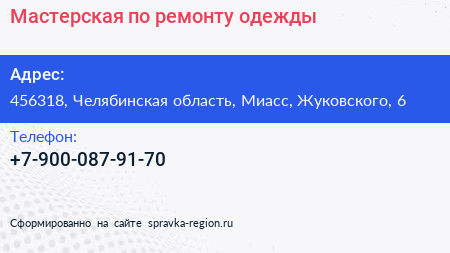 Мастерская по ремонту одежды по адресу 456318, Челябинская область, Миасс, Жуковского, 6 в дальнейшем Организация, размещена в следующих категориях: