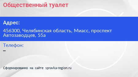 Общественный туалет по адресу 456300, Челябинская область, Миасс, проспект Автозаводцев, 55а в дальнейшем Организация, размещена в следующих категориях: