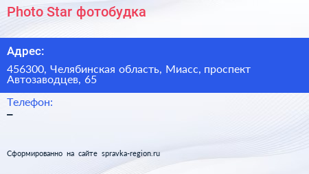 Photo Star, фотобудка по адресу 456300, Челябинская область, Миасс, проспект Автозаводцев, 65 в дальнейшем Организация, размещена в следующих категориях: