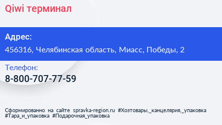Qiwi, терминал по адресу 456316, Челябинская область, Миасс, Победы, 2 в дальнейшем Организация, размещена в следующих категориях: