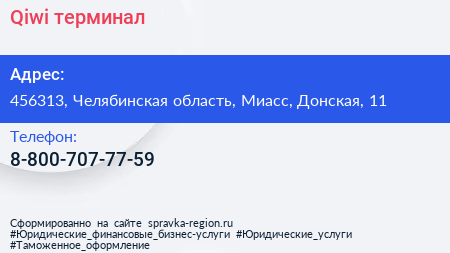 Qiwi, терминал по адресу 456313, Челябинская область, Миасс, Донская, 11 в дальнейшем Организация, размещена в следующих категориях:
