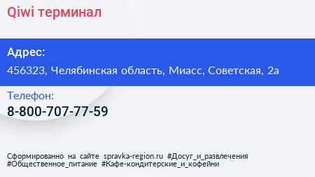 Qiwi, терминал по адресу 456323, Челябинская область, Миасс, Советская, 2а в дальнейшем Организация, размещена в следующих категориях: