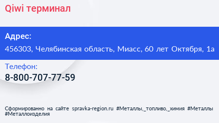 Qiwi, терминал по адресу 456303, Челябинская область, Миасс, 60 лет Октября, 1а в дальнейшем Организация, размещена в следующих категориях: