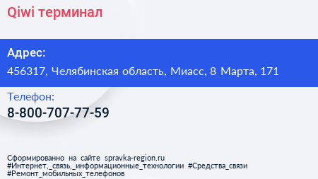 Qiwi, терминал по адресу 456317, Челябинская область, Миасс, 8 Марта, 171 в дальнейшем Организация, размещена в следующих категориях: