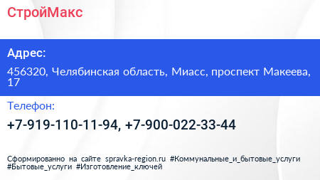 СтройМакс по адресу 456320, Челябинская область, Миасс, проспект Макеева, 17 в дальнейшем Организация, размещена в следующих категориях: