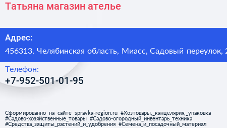 Татьяна, магазин-ателье по адресу 456313, Челябинская область, Миасс, Садовый переулок, 2 в дальнейшем Организация, размещена в следующих категориях: