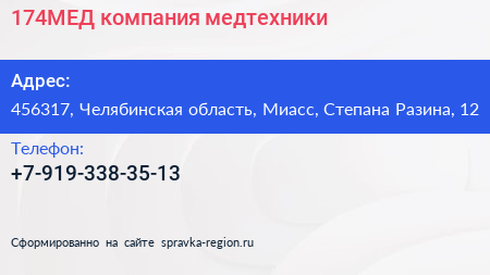 174МЕД, компания медтехники по адресу 456317, Челябинская область, Миасс, Степана Разина, 12 в дальнейшем Организация, размещена в следующих категориях: