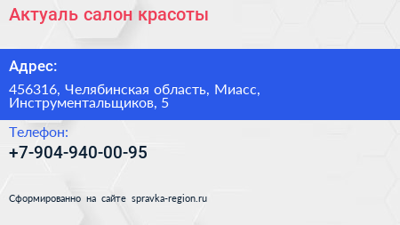 Актуаль, салон красоты по адресу 456316, Челябинская область, Миасс, Инструментальщиков, 5 в дальнейшем Организация, размещена в следующих категориях: