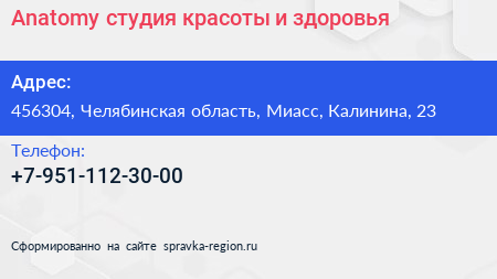 Anatomy, студия красоты и здоровья по адресу 456304, Челябинская область, Миасс, Калинина, 23 в дальнейшем Организация, размещена в следующих категориях: